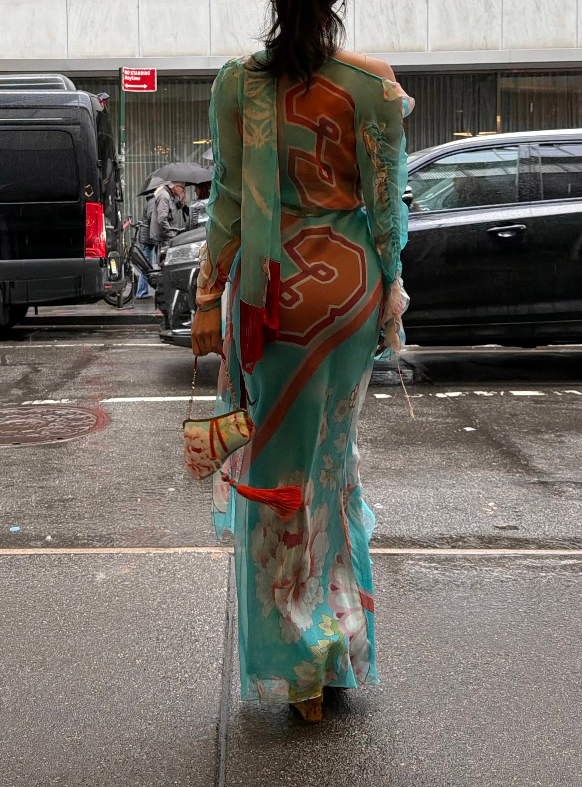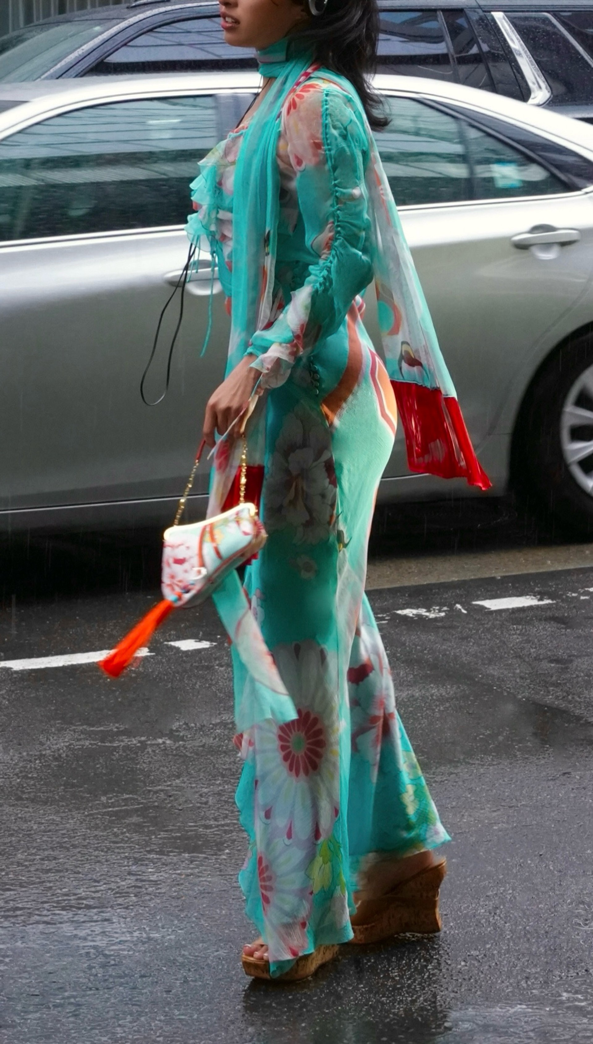 The collection was born from Galliano’s transformative travels through China and Japan but the result was far from a standard travelogue. It was a collision of cultures and a fever dream where 18th century European corsetry met the sharp neon soaked edges of Tokyo street style. This specific look from the Christian Dior archives is the perfect embodiment of that friction. It features a sheer weightless blue organza dress that dances with oversized floral prints yet it is anchored by the aggressive structure of corset lacing and towering platform heels.